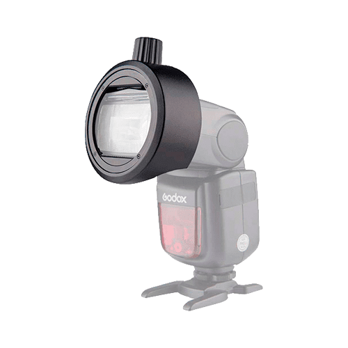 Cabeza adaptadora redonda Godox SR-1 para flashes de mano. Permite convertir el cabezal fresnel rectangular en otro circular. El adaptador esta preparado para colocarle además filtros y modificadores de luz Godox AK-R1 magnéticos (aletas, snoot, geles de color) entre otros. Se adapta al cabezal del flash mediante un tornillo superior de bloqueo.