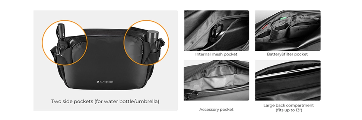 Diseño de cremallera doble antirrobo: La bolsa cuenta con cabezas de doble cremallera que se pueden bloquear junto con los anillos de tracción, lo que agrega una capa adicional de protección contra el robo mientras se está en marcha.Capacidad de transporte de trípode compacto: La bolsa también incluye una sección dedicada para llevar un trípode pequeño, lo que la convierte en una opción ideal para fotógrafos o viajeros que necesitan traer equipo esencial.El Bolso K&F concept KF13.177 es un bolso fotográfico tipo sling diseñado para transportar y proteger tu equipo de forma cómoda, segura y organizada. Con una capacidad aproximada de 12 L, permite llevar una cámara DSLR o mirrorless junto con 2 a 4 lentes y accesorios esenciales, manteniendo todo bien protegido y accesible.