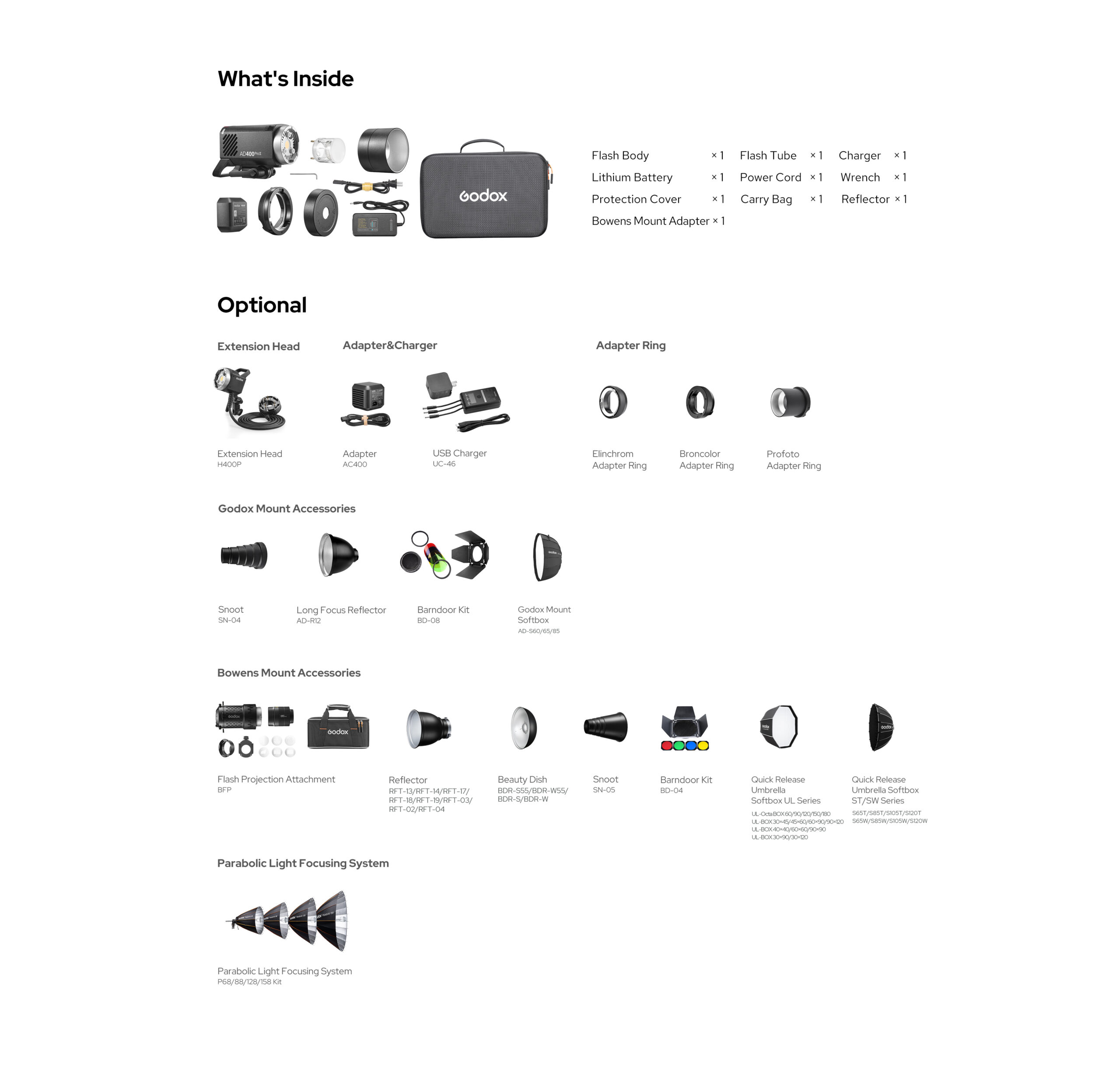 AD400PRO II, AD400PRO II + BD-08 Kit de banderas y filtros, AD400PRO II + 35 x 160 Stripbox Triopo con Grid, AD400PRO II + 60 x 90 Softbox con Grid, AD400PRO II + AC400 Adapador de corriente, AD400PRO II + H400P Cabezal de extención, AD400PRO II + QR-P150 Difusor parabólico