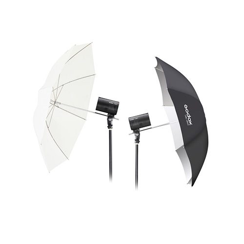 • Paraguas Godox: Incluye dos paraguas (34” plata y 33.5” transparente) para cobertura amplia y difusión de luz.