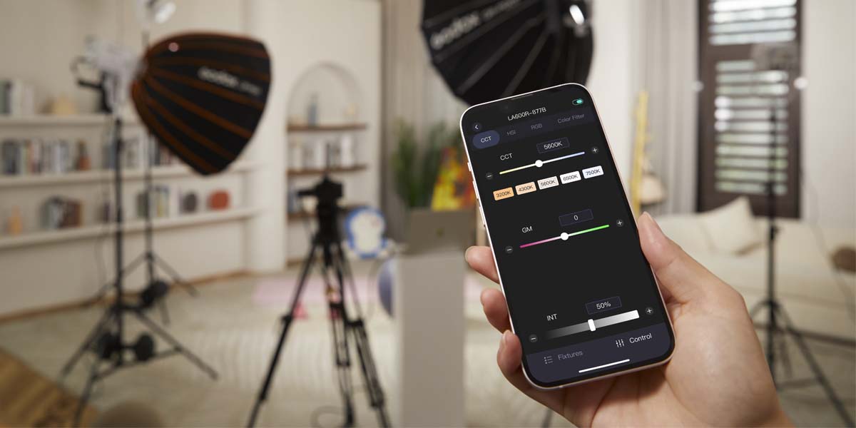 La luz puede controlarse manualmente desde su pantalla LCD o mediante la Godox Light App vía Bluetooth. También es compatible con DMX512/RDM, lo que lo convierte en una excelente opción para instalaciones cinematográficas o control centralizado desde consolas de iluminación (Control no incluido).