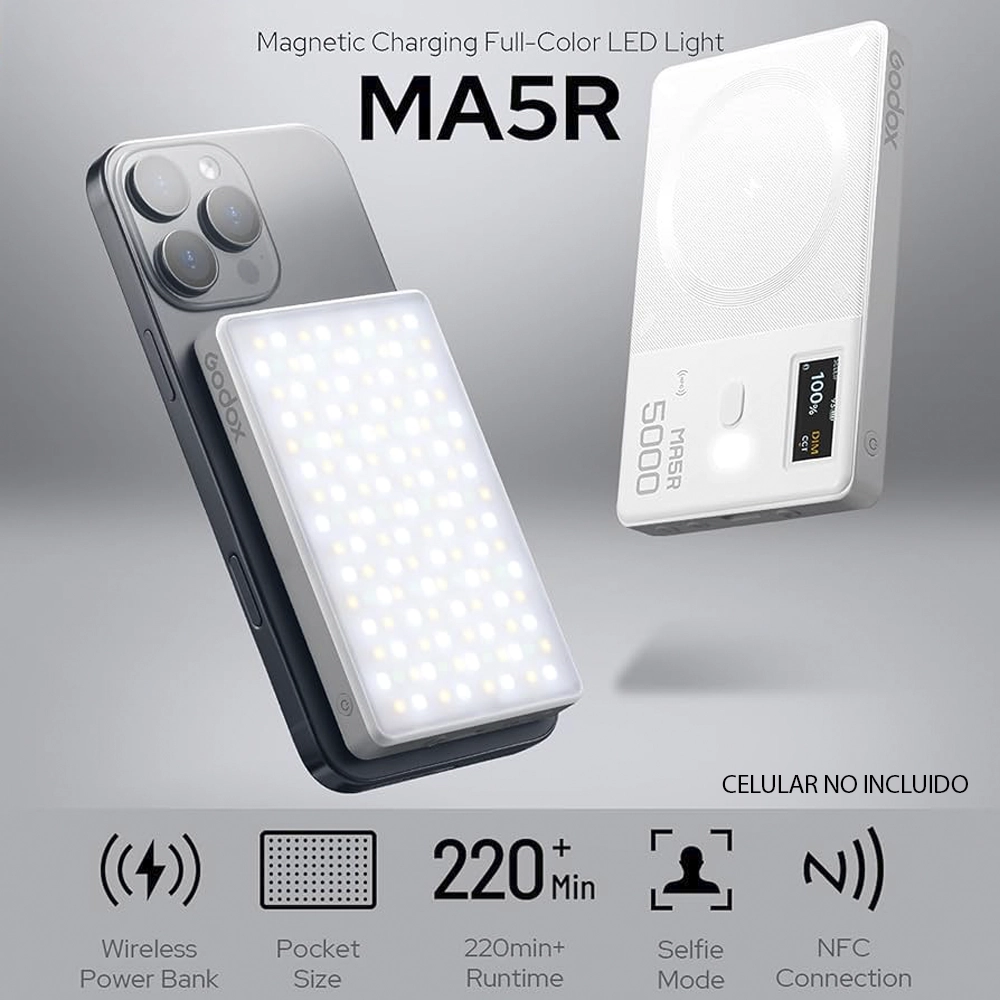 Ilumina y carga desde un solo dispositivo. El Godox MA5R combina un potente panel LED RGB con 14 efectos creativos y un banco de energía magnético de 4.900 mAh, ideal para creadores de contenido que graban en movimiento. Portátil, ligero y compatible con carga inalámbrica Qi2 y MagSafe. Todo lo que necesitas, en tu bolsillo.