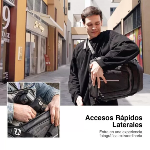 Múltiples accesos (acceso izquierdo/derecho y acceso frontal) le permiten abrrir su bolsa para encontrar rápidamente a su cámara cuando necesita ser rápido para tomar fotos. Utilice los puntos de entrada y los divisores para personalizar la bolsa según sus necesidades.