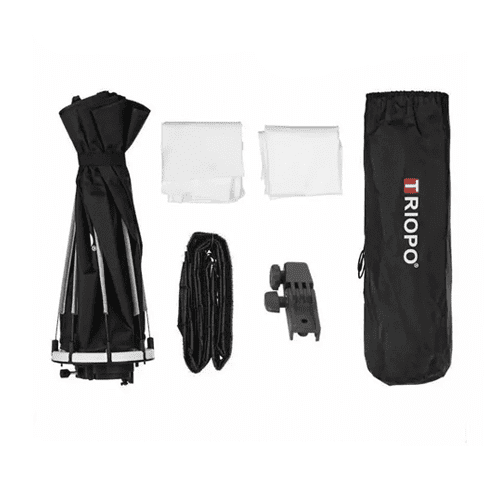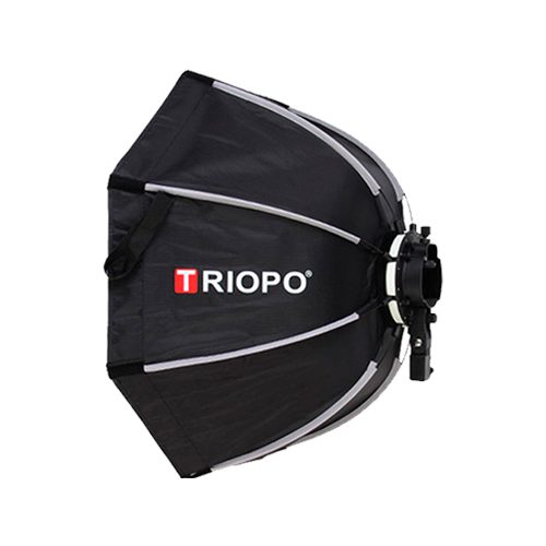 Softbox Octabox TRIOPO para speedlite Min de plegado rápido de 55 / 65 / 90 /120cm con empuñadura y entrada para flash de mano. Incluye doble tela difusora blanca interna independiente. Bolsa de transporte. Tiene un peso total de 716 gramos aproximadamente. Plegado tiene un largo de 42cm.