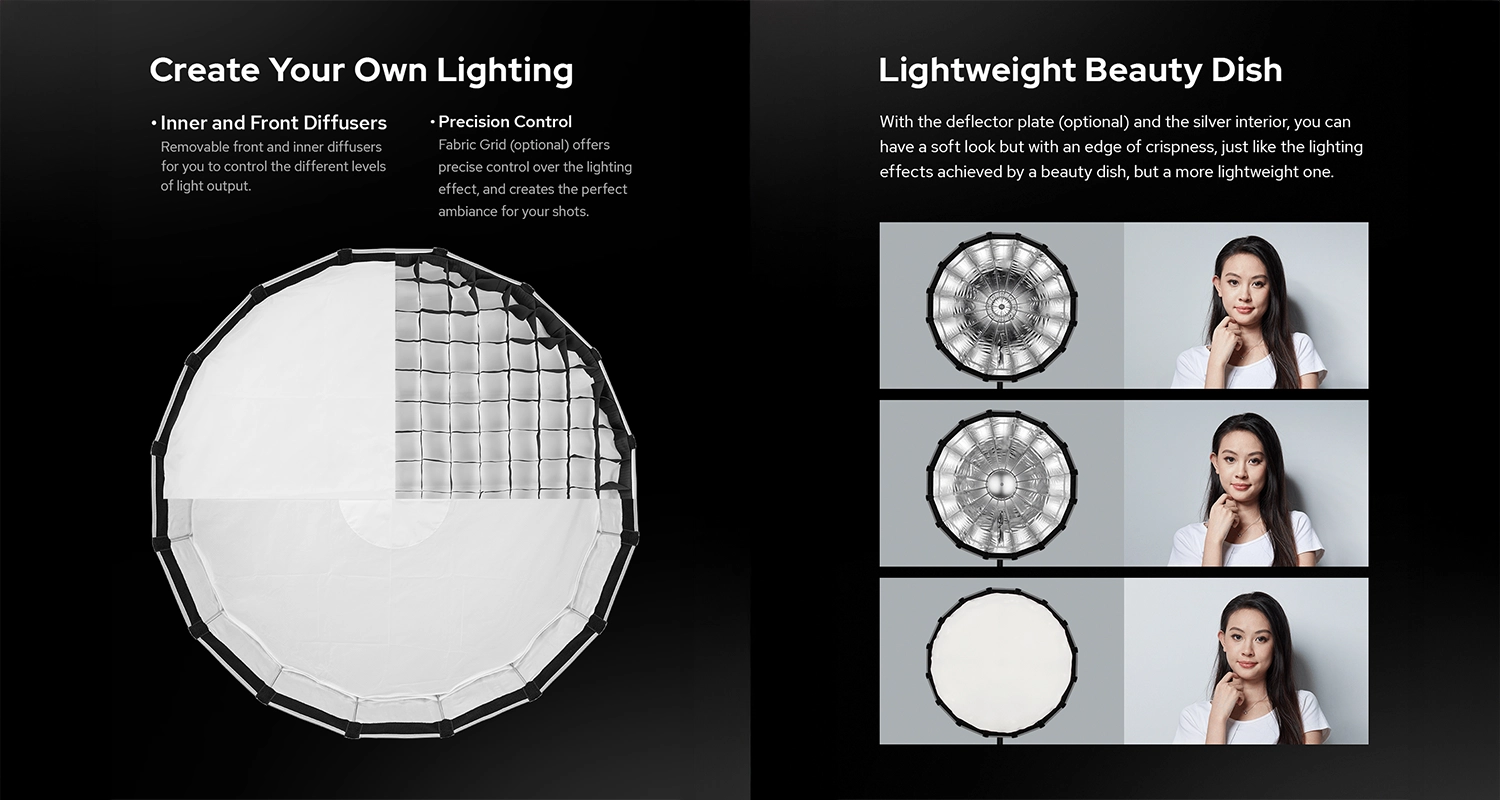 El Softbox Godox S65T /S85T /S120T con Grid y Beauty Dish es una herramienta esencial para fotógrafos que buscan una iluminación suave y controlada. Ideal para retratos, fotografía de moda y productos, este softbox ofrece una iluminación uniforme y de alta calidad.