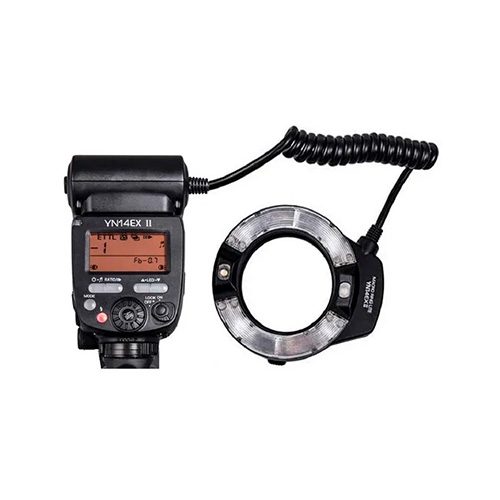 Macro Ring Flash YN14EXII FEC (compensación de exposición con flash), FEB (ahorquillado de exposición con flash), FEL (bloqueo de exposición con flash), sincronización a la segunda cortina, y acceso al menú de la cámara Canon Flash de Luz Doble Anular Macro , permite controlar ratios de intensidad de iluminación con los flashes situados internamente en el lado izquierdo (A) y derecho (B), pudiendo éstos ser controlados a la vez o por separado, creando o evitando sombras más o menos pronunciadas con el objetivo de hacer la foto presentar un efecto tallado Panel LCD de gran tamaño , Visualización en la gran pantalla LCD que le facilitar a ver, ajustar y emplear las funciones del flash Luz LED asistente al enfoque facilitar su uso Compatibilidad con varios diámetros de objetivos 52mm, 58mm, 67mm y 72mm Con el sistema de aviso sonoro activado, los diferentes sonidos pueden indicar distintas situaciones de funcionamiento para ayudarle a hacer la foto. El sistema de reciclado ultra-rápido, Macro Ring Flash YN14EXII el tiempo de reciclado para la completa intensidad de destello sólo requiere 3 segundos. Está equipado con una toma de alimentación externa para satisfacer sus requisitos de reciclado superiores. El YN-14EX puede guardar actualmente sus ajustes de operación para su uso futuroProductos relacionados